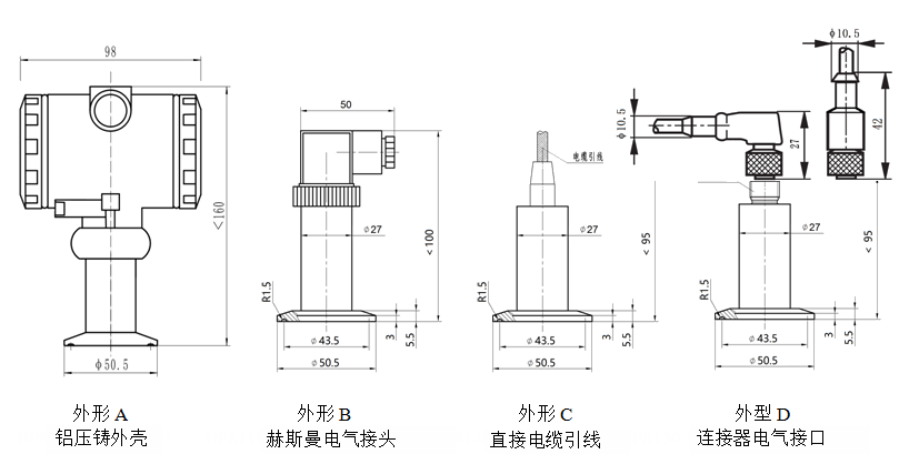 | 压力接口 | M27×1.5,G1/2,G3/4,NPT1/2,不锈钢卡箍式 | |||