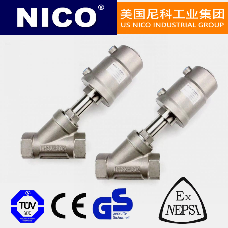 美国尼科NICO进口内螺纹角座阀在非工作状态时,由于弹簧力作用,阀门常闭(开),当执行器活塞被压缩气体作用时,阀门打开(关闭)。双作用形式靠压缩气体控制阀门开关