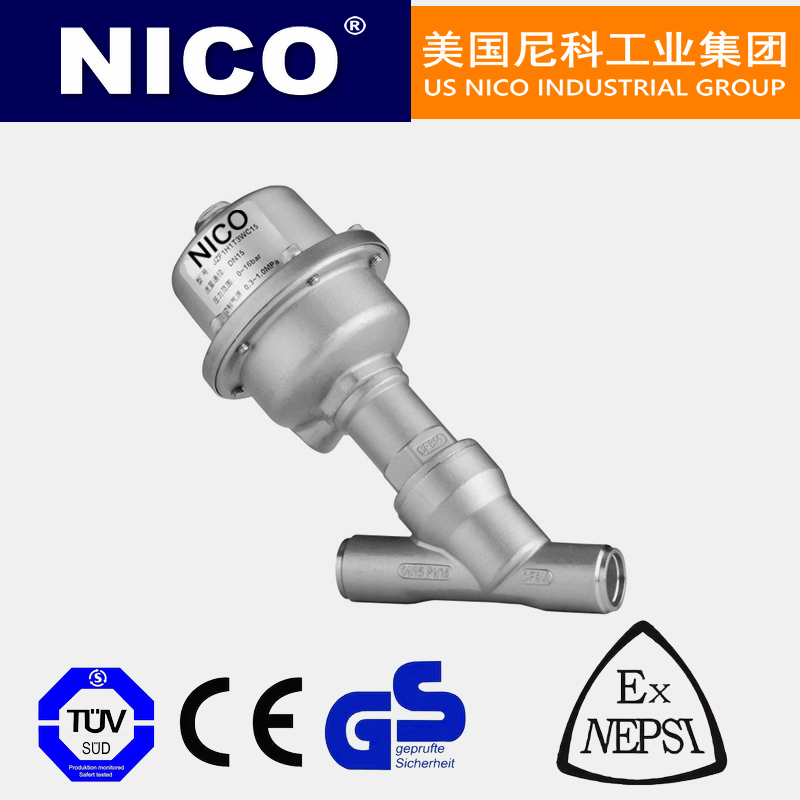 美国尼科NICO进口防水锤角座阀在非工作状态时,由于弹簧力作用,阀门常闭(开),当执行器活塞被压缩气体作用时,阀门打开(关闭)。双作用形式靠压缩气体控制阀门开关。