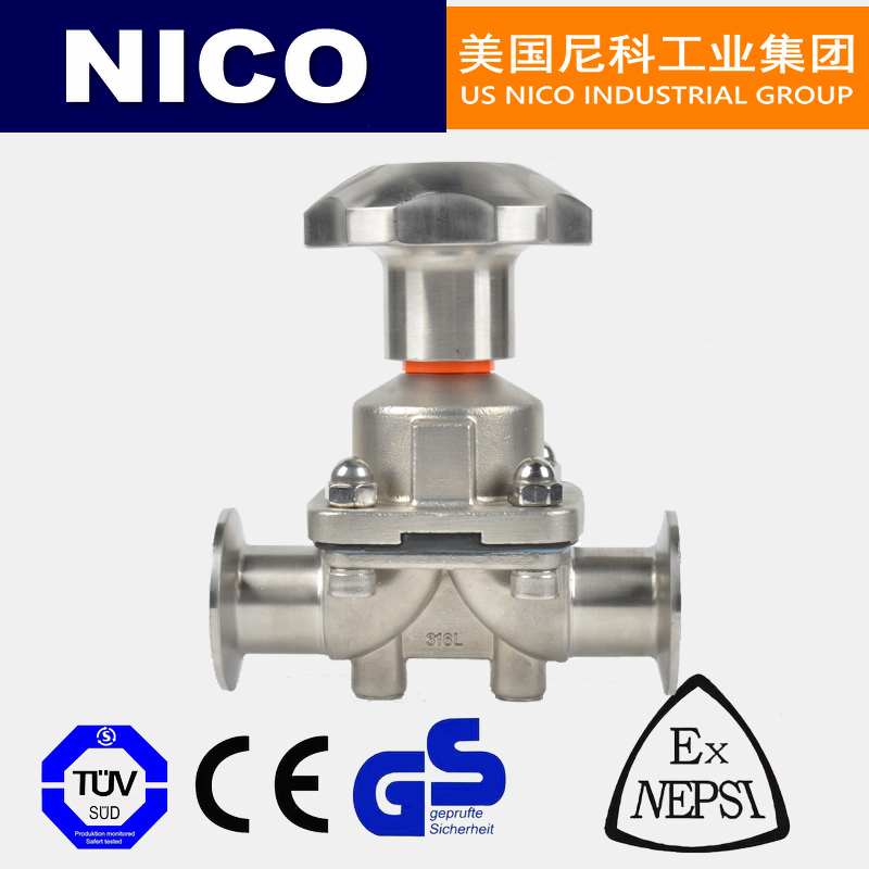 美国尼科NICO进口卫生级快装卡箍式隔膜阀是用隔膜作启闭件封闭流道、截断流体、并将阀体内腔和阀盖内腔隔开的截止阀。既可通过一个气动头进行遥控操作,也可以通过一个手柄进行手动操作。