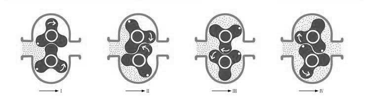 德国NOOK诺克@进口不锈钢转子泵采用的二叶、三叶、碟形、多叶型的转子,是一种双转子旋转式多用途容积式输送泵。进口无极调速转子泵转速低、输出扭矩高、耐高温、耐腐蚀等特点,是一种卫生型的容积式输送泵,其独特的工作原理和特点使其在高粘度、高温度、高腐蚀性的物料的输送中得以体现,其输送过程平稳、连续,并且能够保证物料在输送过程中物理性能不被破坏,可输送的物料的粘度高达1000000CP。进口无极调速转子泵配有三叶泵,鞋底泵等。依靠两同步反向转动的转子(齿数为2-4)在旋转过程中于进口处产生吸力(真空度),从而吸入所要输送的物料。两转子将转子室分隔成几个小空间,并按a→b→c→d的次序运转。运转至位置a时,只有I室中充满介质; 到位置b时,B室中封闭了部分介质; 到位置c时,A室中也封闭了介质; 到位置d时,A、B室与Ⅱ室相通,介质即被输送至出料口。如此循环往复,介质(物料)即被源源不断地输送出。具体工作原理见示意图。