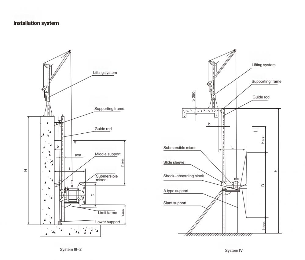 进口低速推流器可以有多种安装方式,这里提供四种通用的方式供选择,尺寸可参考下表。还可以根据用户的要求作特殊设计。